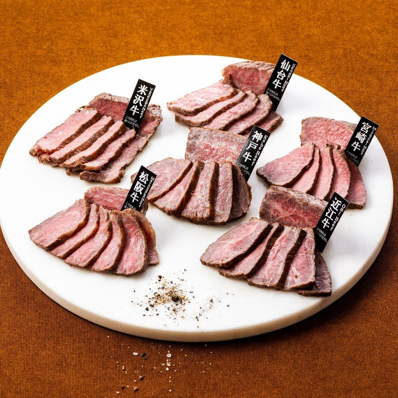脂肪が肉に細かく入り込んで濃厚な旨みの神戸牛、“肉の芸術品”と言われる松阪牛、良質な身の締まりと脂肪ののりの良さが特徴の米沢牛、最も歴史のあるブランド和牛の近江牛、やわらかさ、味わい、色合いの素晴らしさが実感できる宮崎牛、脂肪と赤身の絶妙なバランスの仙台牛、それぞれの味わいをローストビーフでお楽しみください。
