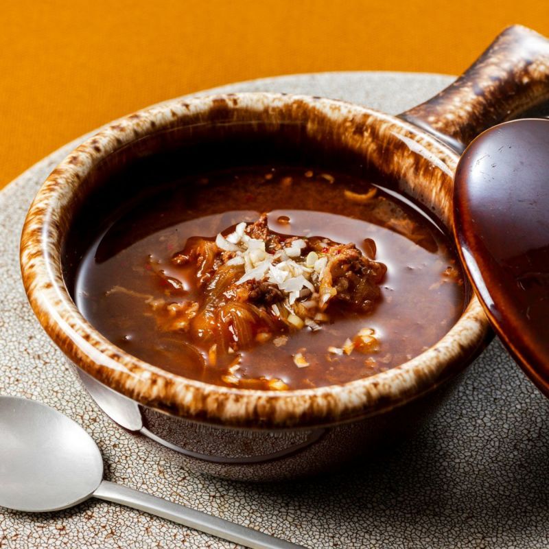 韓国料理のユッケジャンスープを、辛さをおさえたマイルドな味わいに仕上げました。西京味噌で作ったコチュジャンを使用し、黒毛和牛と玉ねぎ、白ネギの旨みと甘味が溶け込んだスープです。
